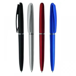Lapicero plástico con pintura metalizada y sistema de apertura twist (giratorio), con clip de color del lapicero y aro central metálico que le da un acabado sobrio.
